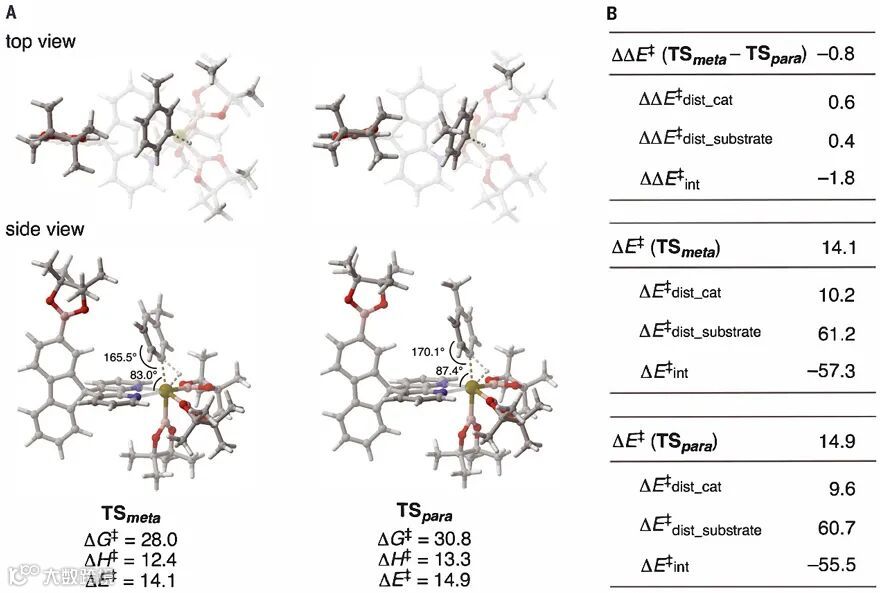 )。进一步分析表明,间位选择性可归因于间位过渡态中较大的相互作用能[Δ