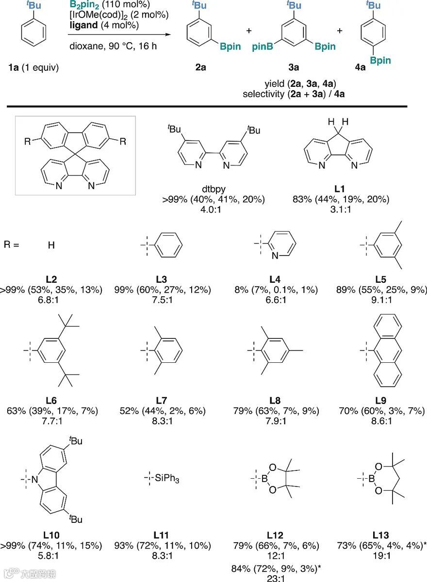 )时,硼酸酯基团与芴基团以平面排列方式解决了上述基团的构象柔性问题,从而实现了高的间位选择性(12:1),同时二硼化收率较低(7%)。最后,在[IrOMe(cod)