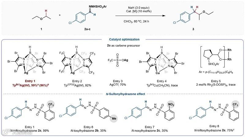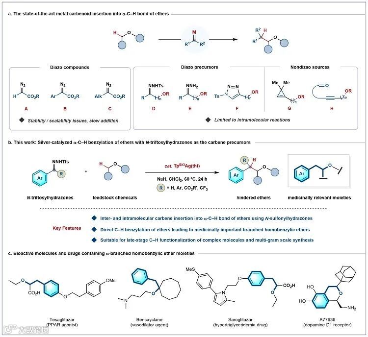 导读:东北师范大学毕锡和教授课题组结合邻三氟甲基苯磺酰腙的易分解性和银对卡宾的配位弱稳定作用,即时生成高亲电银卡宾,首次实现了分子间磺酰腙对醚α-C−H键的选择性插入,合成了一系列药物学重要的高苄基醚化合物