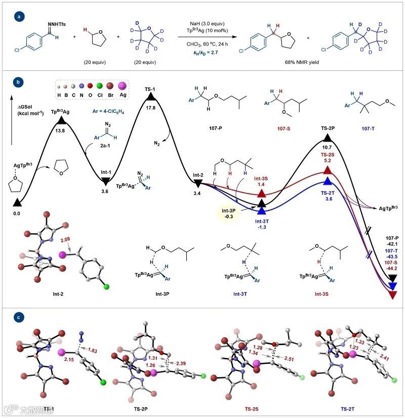 Ag(thf) 与甲基环己基醚在标准条件下混合,分离得到了醚交换的银复合物,证实了醚氧原子确实可能与银催化剂竞争配位。接着,详细的DFT计算显示,银催化醚α-C−H键插入反应过程与烷烃C−H键插入过程高度相似,银卡宾的形成是整个反应的决速步骤。在THF和