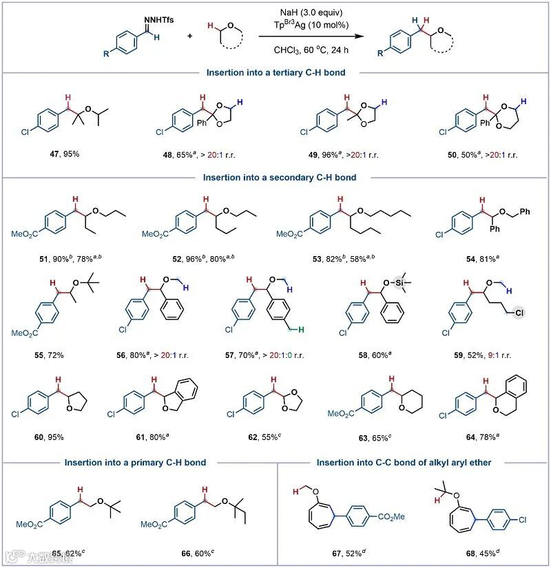 随后,作者研究了醚组分的范围(图4)。位阻较大的二级烷基醚和缩醛,常见的二烷基醚和苄基醚,均以较高产率生成了相应的α-C−H插入产物。各种饱和环醚也能都顺利反应得到相应的苄基氧杂环化合物。增加醚的浓度后,反应活性较低的甲基醚也能以中等的收率得到一级C(