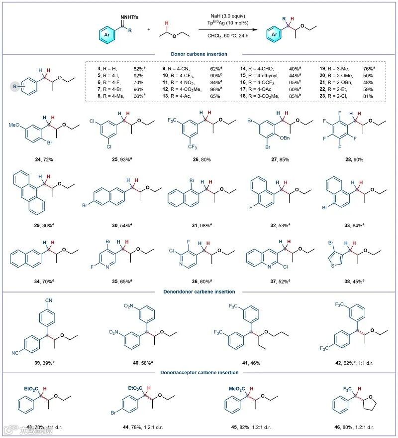 -邻三氟甲基苯磺酰腙都能高效地与乙醚发生α-C−H键的插入反应。各种常见的官能团,如卤素(F、Cl、Br和I)、吸电子基团(