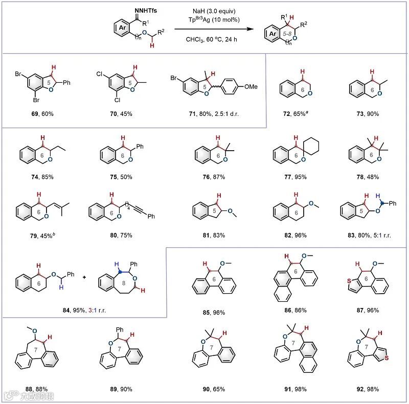 -邻三氟甲基苯磺酰腙倾向于发生分子内的2° C−H键插入反应以形成五元环(二氢化茚)和六元环(四氢化萘),带有苄基醚的