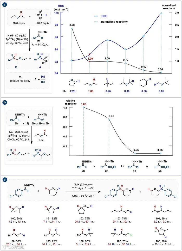 随后,作者以乙醚α-C−H键为参照,通过竞争实验比较了银卡宾与各类C(
