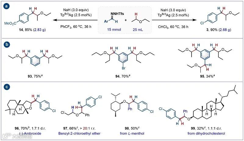 )–H键插入产物。但是,芳基烷基醚只能得到衡量的C–H键插入产物,主要发生Büchner反应,以中等收率得到了环庚三烯。