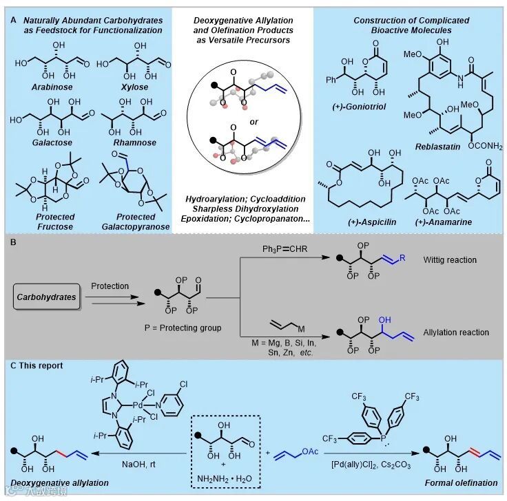 最近,加拿大皇家科学院院士、麦吉尔大学的李朝军(Chao-Jun Li)院士课题组报道了一例利用极性翻转策略实现碳水化合物的直接脱氧烯丙基化和烯烃化反应,提供一条解决上述问题的有效途径。该反应不仅兼容多种天然碳水化合物,而且条件温和、简便、羟基不一定需要保护,一步实现直接将碳水化合物转化为含有多个手性中心的合成子。论文还通过合成应用和后段修饰展示了该方法的普适性和实用性。这一成果近期发表在Science Advances 上,文章的第一作者为博士后阚剑。