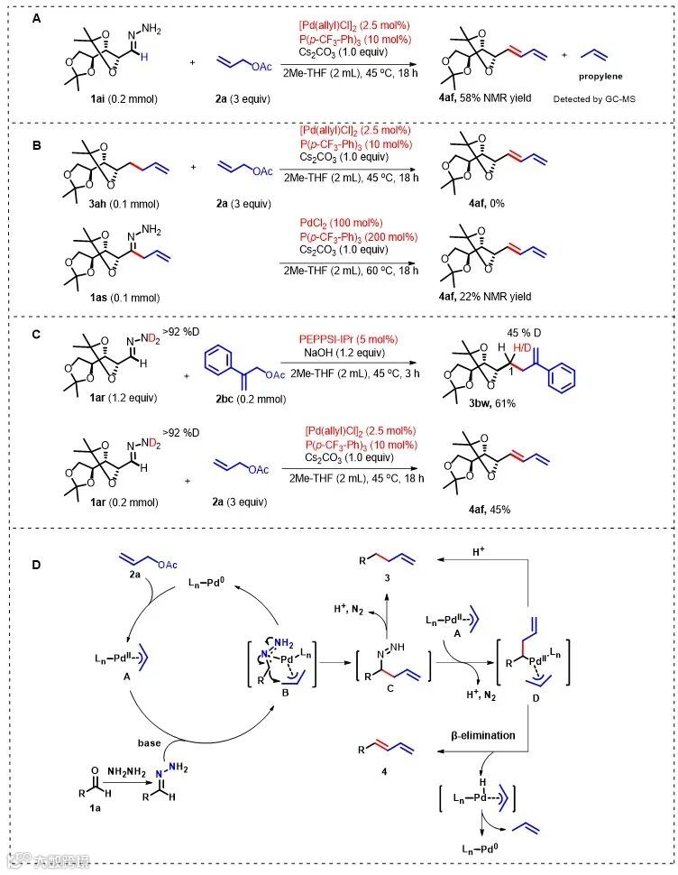 经过一系列条件优化,作者得到了两个最优反应条件 (Fig. 2A):以5%摩尔当量的钯作为催化剂,控制配体和碱的不同,可以选择性的获得烯丙基化产物或者得到1,3-二烯产物。当以氮杂卡宾作为配体,NaOH或t-BuOLi为碱时,反应只生成烯丙基化产物3aa,而以P(p-CF3C6H4)3或者P(p-FC6H4)3作为配体,Cs2CO3为碱时,则以高选择性的生成1,3-二烯产物4aa。
