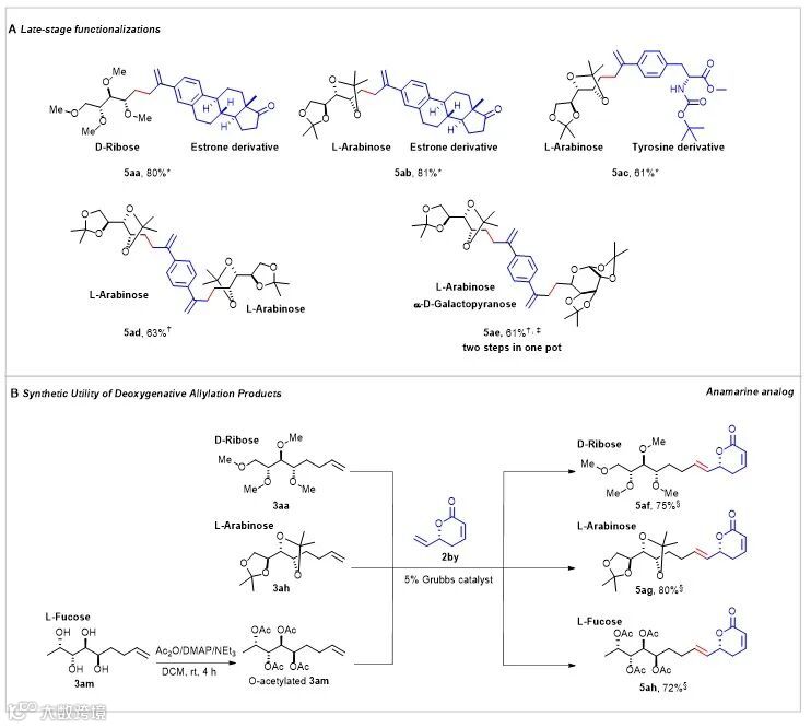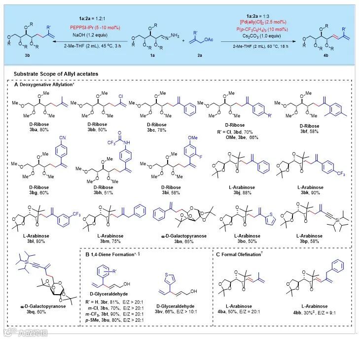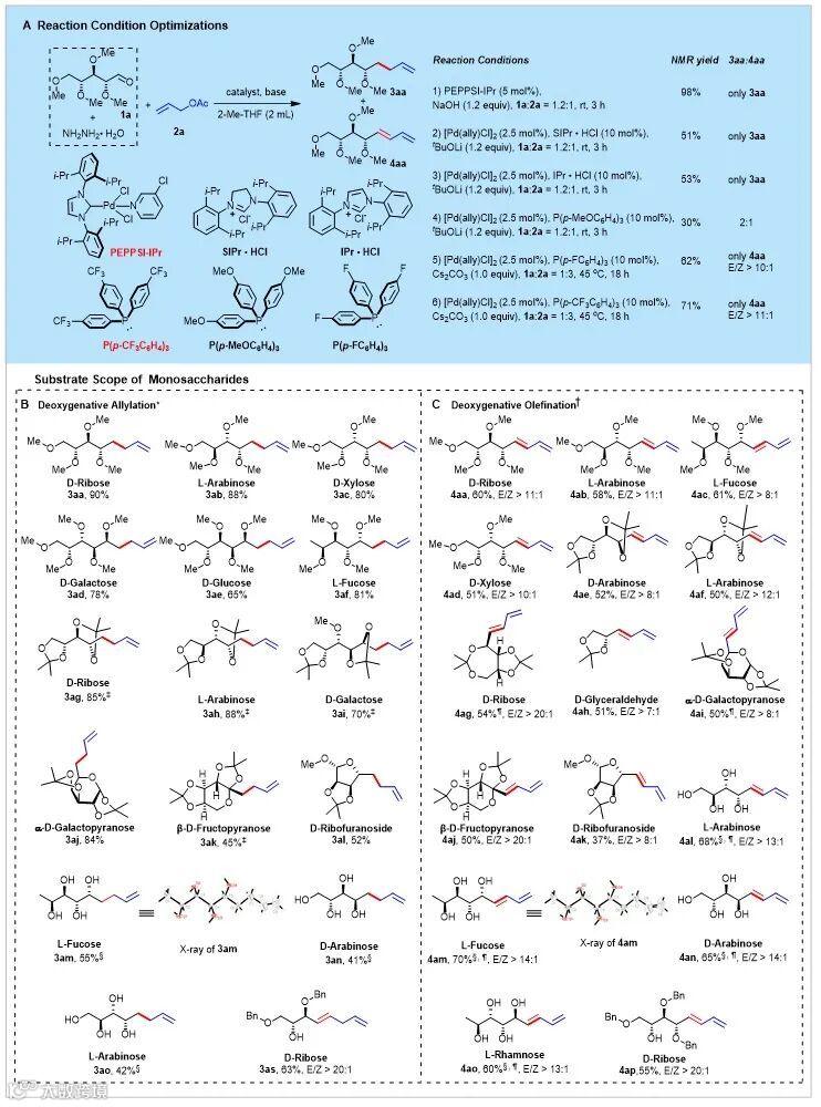 随后作者分别对糖底物的普适性进行了考察,不同链长单糖如三、四、五、六碳糖、链状或环状都能获得比较好的收率(Fig. 2B)。反应对不同的保护基如甲基醚、丙酮叉、苄基醚等都能很好的兼容。值得注意的是,带有部分保护或裸露的多个羟基的糖也能获得中等到好的产率,表明该反应体系具有很强的兼容性,并且保护基不是必须的。通过单晶衍射确定了烯丙基化产物3am和1,3-二烯产物4am两产物的绝对构型,确认了反应底物中的多个手性羟基在反应过程中绝对构型没有发生变化。