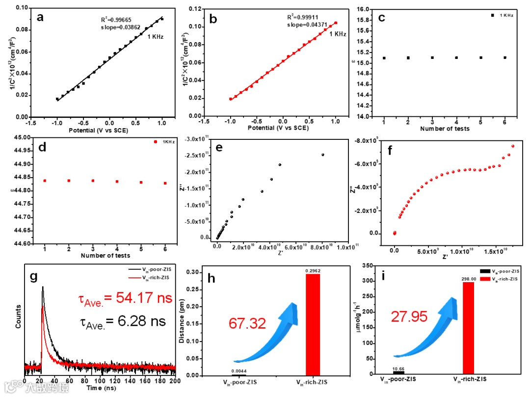 图2. 室温下VIn-poor-ZIS(a)和VIn-rich-ZIS(b)的莫特肖特基曲线。室温下,样品的相对介电常数(由LCR仪器测定)VIn-poor-ZIS(c)和VIn-rich-ZIS(d)。(e–f)室温下固体圆片(两面涂有银胶并粘银线)样品的的阻抗图。(g) 样品的TRPL。(h–i)样品的LD和催化效果。