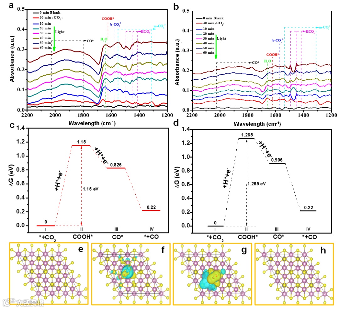 图3. VIn-rich-ZIS(a)和VIn-poor-ZIS(b)的原位红外光谱。VIn-rich-ZIS(c)和VIn-poor-ZIS(d)的(001)面上CO2还原为CO的自由能图。VIn-rich-ZIS(e–h)上CO2还原为CO过程中的差分电荷密度图和中间体模型。
