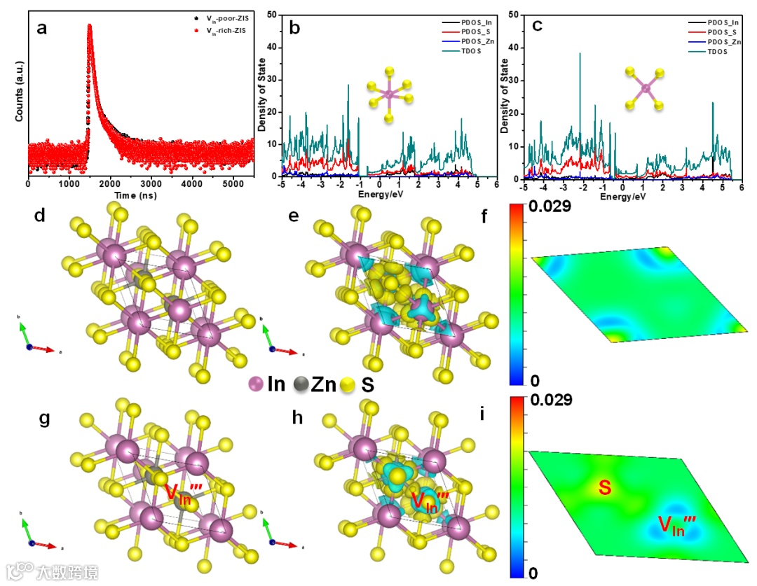 图1. (a)样品的正电子湮没光谱(PAS)。(b)富含VIn1(六配位)的ZIS和(c)富含VIn2(四配位)的ZIS的能带结构和态密度(DOS)。带电荷密度等值线图的晶体结构和价带边缘的差分电荷密度分布是沿(001)晶面靠近In空位和S原子的电荷密度剖视图,从0(蓝色)到0.029 e(红色)绘制。(d–f)VIn-poor-ZIS,(g–i)VIn-rich-ZIS。