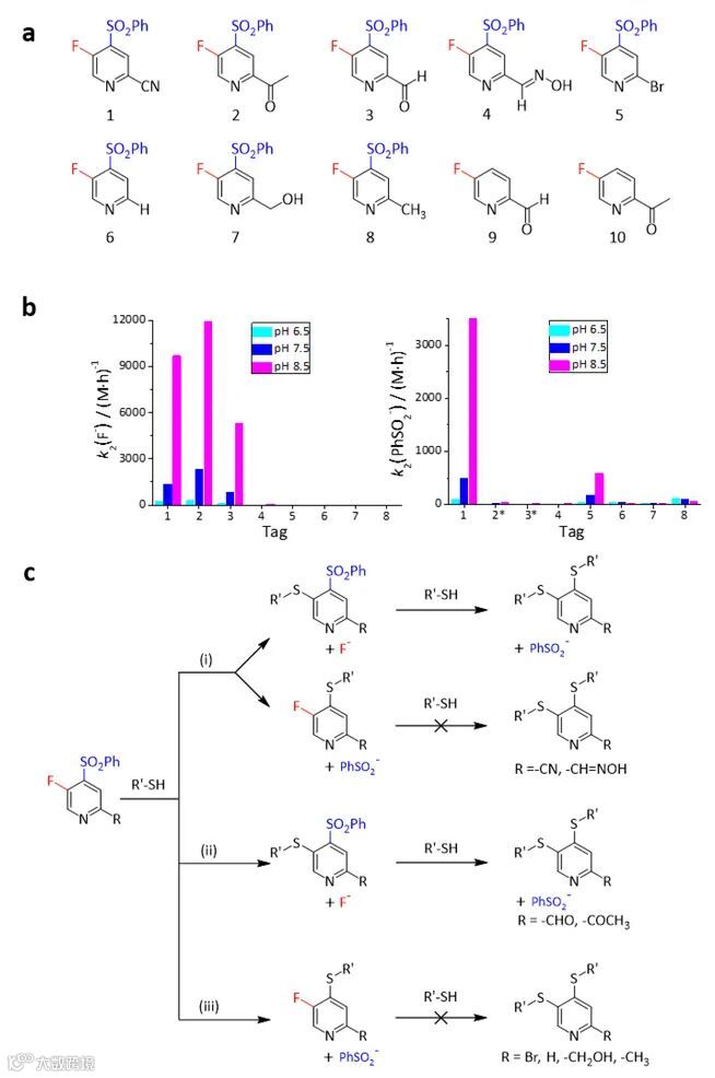 图1. 含有氟和苯砜基的吡啶衍生物的化学结构式以及这类小分子在水溶液中与自由巯基的反应速率和反应机制。图片来源:Angew. Chem.