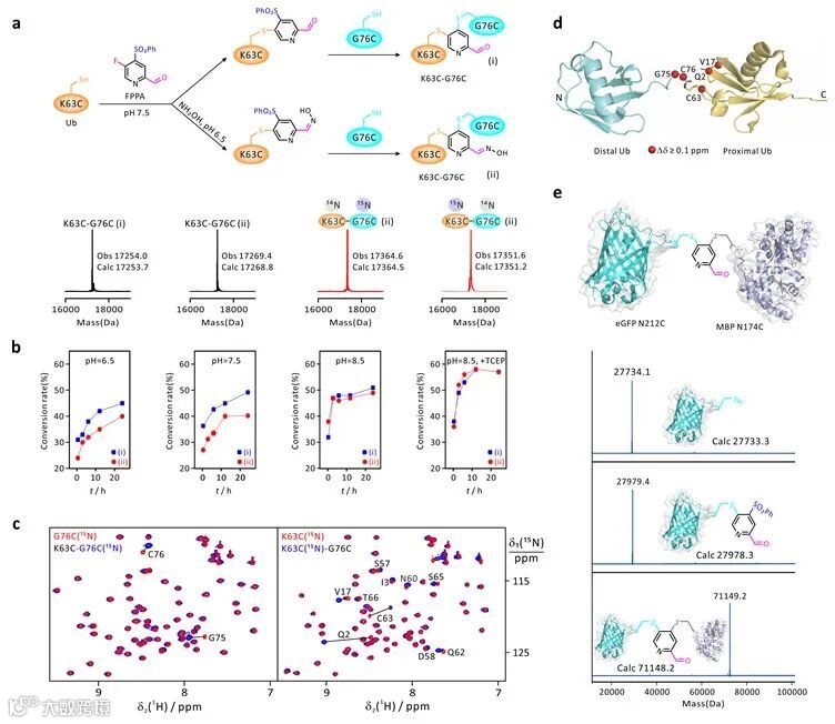 研究人员首先系统评价了FPPA对小分子如巯基乙醇和半胱胺酸的偶联反应并得到了较好的结果。随后利用ubiqutin、MBP、eGFP、XIAP、HSP90和Taq聚合酶等不同蛋白质系统评价了FPPA在多聚泛素(ubiquitin)、不同蛋白质间的交联(MBP和eGFP)、多结构域蛋白质(XIAP, HSP90和Taq)的重构等偶联反应中的效率和选择性(图3和图4)。结果表明,FPPA均表现出较高的连接效率。FPPA中的氟与第一个自由巯基的反应可以在生理条件下两个小时内定量完成,对于相同浓度的蛋白质反应物(~0.1 mM),第二步反应的苯砜基与第二个蛋白质的巯基在pH 8.5下可以在三个小时内完成,而提高第二个蛋白质的浓度可以显著提高连接效率。在pH 6.5下,第二步的醛基与N端半胱氨酸的环化速率更快,连接效率更高,并且在该条件下苯砜基对自由巯基没有明显的反应活性。