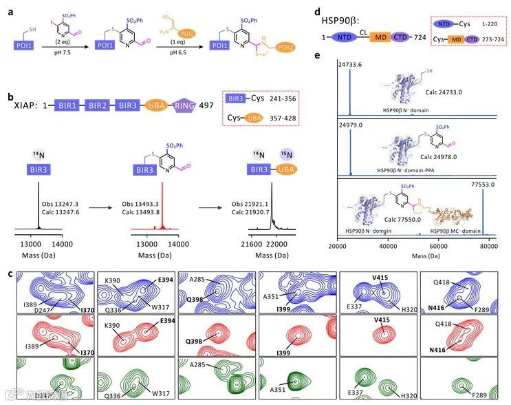 南开大学苏循成教授团队致力于发展蛋白质定点标记方法并应用于细胞内原子分辨率水平上的蛋白质动态结构与互作和重要生物小分子的活性定量分析。该团队前期研究发现吡啶上的苯砜基是生理条件下自由巯基的特异反应基团,并且通过高分辨核磁共振确认了该反应机理和产物(Chem. Commun., 2015, 2824),从而建立了基于吡啶苯砜基定点修饰蛋白质的反应策略并应用于不稳定酶催化中间体的三维结构测定(Angew. Chem. Int. Ed. 2016, 52, 13744)、细胞内蛋白质的三维结构测定(Chem. Commun. 2016, 10237)与细胞内联用NMR和EPR技术研究蛋白质三维结构变化和稳定性的方法(Angew. Chem. Int. Ed. 2017, 56, 2014; PNAS 2020, 117, 20566),并对苯砜基定点修饰蛋白质进行了较详细的论述(Acc. Chem. Res. 2019, 52, 1675)。为提高吡啶中苯砜基对于自由巯基的反应性,研究人员设计了一系列含有氟和苯砜基的吡啶衍生物(图1)并对这些小分子化合物与半胱氨酸等小分子巯基化合物的反应活性在不同pH情况下进行了定量测定。研究发现图1中化合物1-4中的氟和苯砜基均对自由巯基表现出活性,其中化合物1-3中的氟与苯砜基相比对小分子巯基表现出更高的反应活性(图1b)。化合物3(5-氟-4-苯砜基-皮考啉醛, FPPA)和4中的氟和苯砜基对巯基的反应可以视为两步反应。而化合物5-8中的氟没有表现出对巯基的反应活性,仅仅苯砜基表现出对自由巯基的反应活性,但是远低于1-3中的苯砜基活性。综合来看,在以上这些小分子化合物中,氟对巯基的反应性取决于其邻位苯砜基和对位取代基的拉电子能力,具体反应机制如图1c所示。由于FPPA中的氟和苯砜基均对自由巯基有较高的反应性,并且醛基可以与1,2-氨基硫醇发生环化反应,因此FPPA可以充当良好的蛋白质偶联试剂。基于此,FPPA可以首先通过氟与第一个蛋白质自由巯基的反应引入第一个蛋白质,随后可以通过苯砜基与第二个蛋白质的巯基进行亲核取代反应或者通过醛基与含有N端半胱氨酸的蛋白质发生环化反应,以此形成两个蛋白质或多个蛋白质的串联反应(图2)。