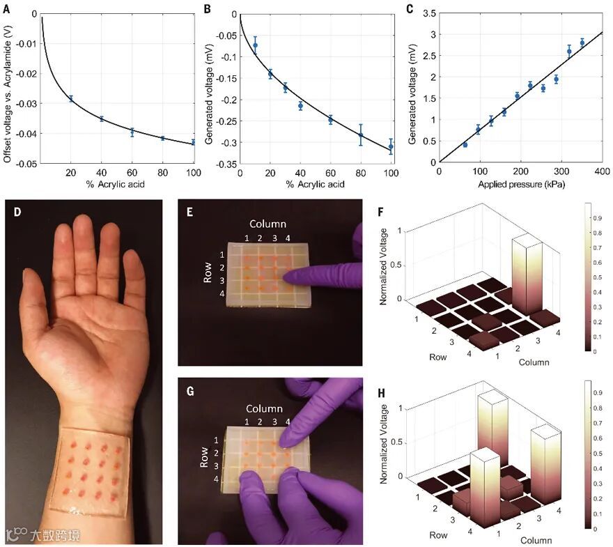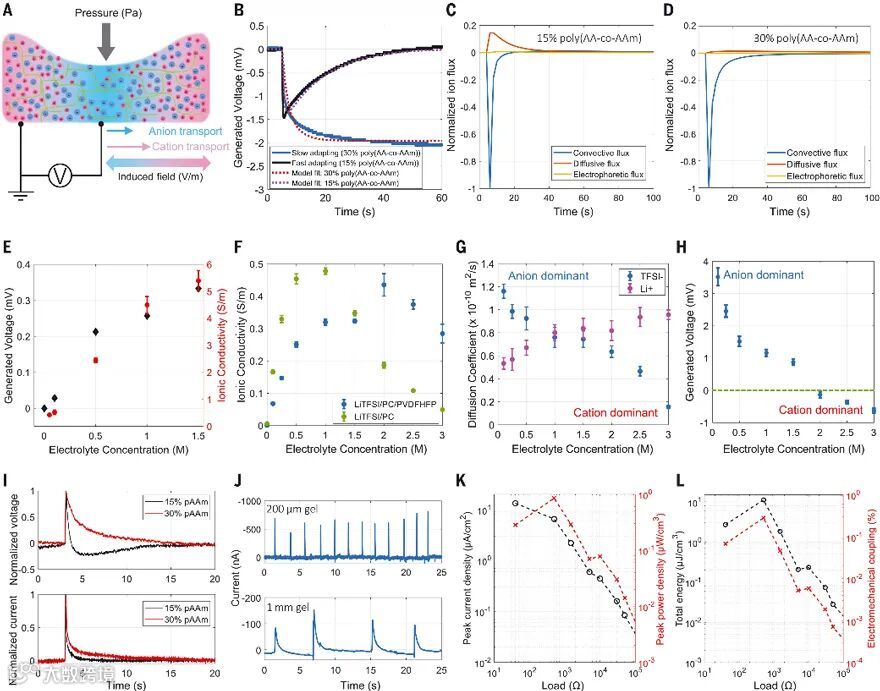 细胞膜内存在对电压敏感的离子通道,在感受到内外电位差后就会打开。受到生物传感的启发,作者使用水凝胶直接产生离子电流以响应压力梯度。与皮肤中通过机械门控释放跨膜唐南电位的机械感受器不同(下图A),压电离子传感器的工作机制基于压力驱动的离子流动(下图B)。如下图B所示,水凝胶压电离子皮肤具有由聚(丙烯酸)(polyAA,带电)和聚丙烯酰胺(pAAM,中性)之间的固定电荷浓度差异所导致的内置电位差。带电侧的压力会产生溶剂和质子的流动,从而增大这种电位差。在水凝胶离子导体制备的压电离子基质中,开路电压与施加的压力成正比。其中,压电离子系数一般在0.01~100 nV/Pa范围内,具体取决于离子种类和基质的性质。
