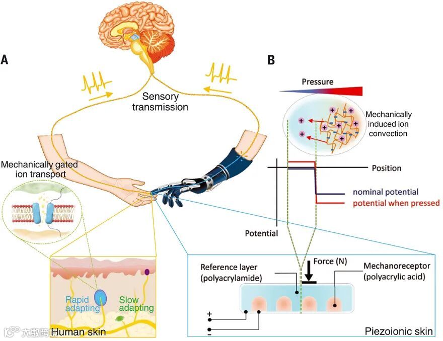 尽管人们很早就发现,按压水凝胶时会产生电压,但科学家们并不清楚响应信号的产生机理。近日,加拿大不列颠哥伦比亚大学(UBC)John D. W. Madden课题组在Science 杂志上发表论文,深入研究了水凝胶的压电离子效应,证明了当水凝胶材料受到挤压时,由于阴离子和阳离子迁移率不同,会产生离子梯度,从而产生电压信号,信号大小和持续时间取决于阳离子和阴离子迁移率的差异。他们展示了几种潜在的应用,包括压电离子皮肤(piezoionic skin)和周围神经刺激。该研究激发了离子皮肤的潜在新应用,为压电离子传感模拟神经调节提供了新的可能性。