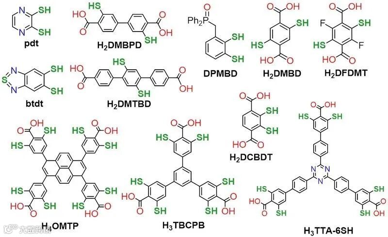 该课题组长期致力于羧基-硫醇组合的配体合成,图2所示配体大部分为本课题组参与合成。具体文献可参阅早期已报道的 H2DMBD (请见J. Solid State Chem., 2009, 182, 1821)、H2dfdmt (请见Chem. Commun., 2020, 56, 3645)、H2DMBPD(请见Inorg. Chem., 2019, 58, 1462)、H3TBCPB (请见Nat. Nanotechnol., 2020, 15, 934),最近又合成出全硫醇功能化芳香羧酸配体H2TST(请见ACS Appl. Mater. Interfaces, 2022, 14, 1070)。