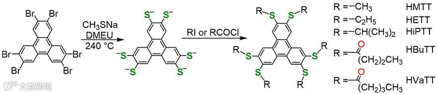 广东工业大学何军课题组2018年报道了一锅法合成2,3,6,7,10,11-六(烷硫基)三苯分子的简易合成工艺(见实验视频期刊JoVE, 2018, e57455)。首先让HBT在240 ℃下与过量的甲基硫酸钠反应生成DMEU中的2,3,6,7,10,11-三苯基六硫代酸(HTT-阴离子)。在不分离的情况下,卤代烷可以直接与HTT-阴离子反应生成2,3,6,7,10,11-六(烷硫基)三苯(图3)。原位水解硫酯,避免了硫醇与金属离子反应过快,极大改善了产物结晶性。