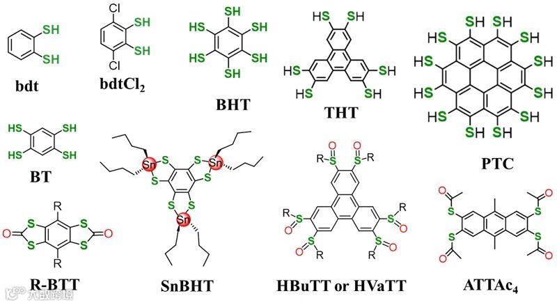 图1. 具有二硫代烯单元的硫醇配体及掩蔽式硫醇芳香配体。