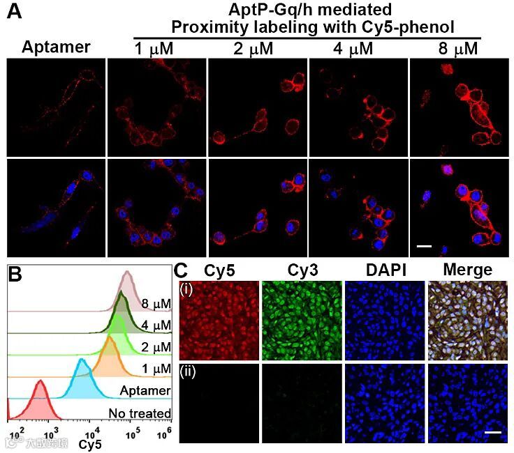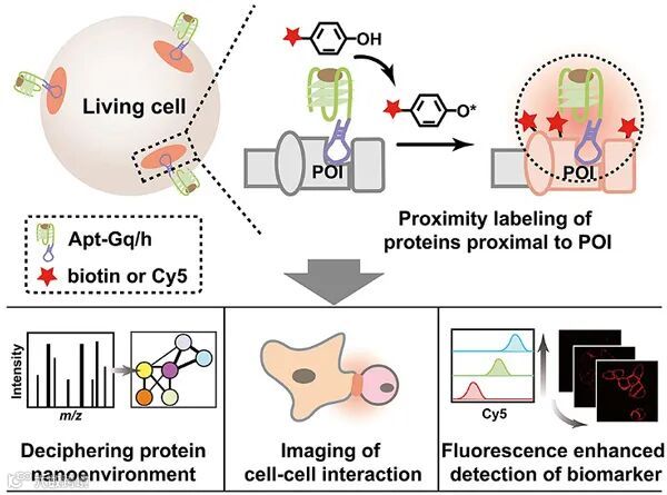 图1. Apt-Gq/h用于活细胞膜蛋白邻近标记反应示意图。