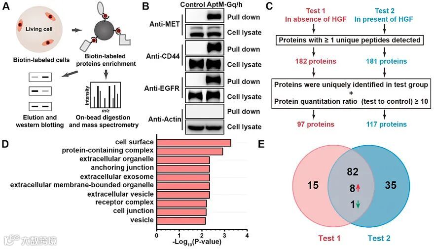 图2. (A)Apt-Gq/h诱导的邻近标记应用于活细胞蛋白质组学分析示意图;(B)免疫印迹法表征Apt-Gq/h介导的HT29细胞中MET及其已知相互作用蛋白的生物素化;(C)质谱数据过滤方案。Test 1:无HGF刺激的细胞;Test 2:HGF刺激的细胞;(D)Apt-Gq/h介导标记的HT29细胞中细胞组分术语富集分析;(E)比较HGF刺激前后细胞中MET微环境中蛋白质组列表的维恩图。Test 1:无HGF刺激的细胞;Test 2:HGF刺激的细胞。