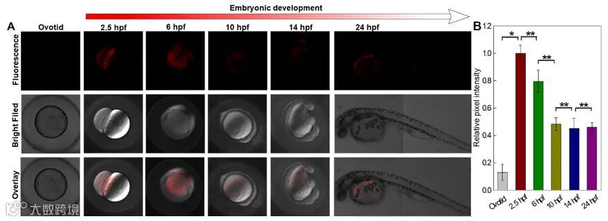 图2. 斑马鱼胚胎发育阶段H2Sn荧光成像图(A)及荧光强度对比图(B)