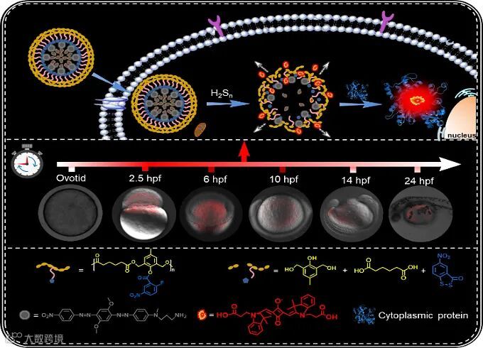 近日,湖南师范大学杨荣华教授与长沙理工大学周怡波博士合作,以H2Sn响应型聚合物胶束为载体,负载大量胞浆蛋白结合增强型染料构建纳米信标。纳米信标进入胚胎细胞内后,被内源性H2Sn激活,释放并点亮染料荧光,且染料分子可与胞浆蛋白结合,大幅度增强荧光信号。因此,该聚合物纳米信标对H2Sn展现出极高的响应灵敏度,可实现对胚胎发育过程中内源性H2Sn的荧光成像。