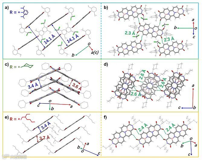 B2N2-PDI的B-N键长在1.45 Å左右,这是典型的BN离域双键的键长。由于二异丙基苯基的位阻大,所以在6-DIPP的晶体中分子与分子之间并没有π–π相互作用而是形成了氢键。同时,二氯甲烷溶剂分子也通过氢键连接了上下两层6-DIPP分子。而在6-CH晶体中,由于侧链的位阻减小,分子间有π–π相互作用,其π–π距离大约为3.4 Å。6-EH的晶体中,烷基链位阻进一步减小,出现了滑移的柱状堆积。其π–π距离与6-CH类似,大约为3.4 Å。在6-CH和6-EH的晶体中,最短的分子间B-N距离分别为3.7 Å 和 3.6 Å。这意味着B2N2-PDI晶体中存在B-N偶极相互作用。