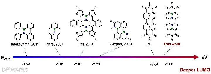 近年来,硼氮杂多环芳烃以其独特的光电性质以及在有机半导体器件中的应用而受到越来越多的关注。然而,目前报道的硼氮杂多环芳烃大多是p型半导体。仅有少数利用硼氮配位键构筑的硼氮杂多环芳烃展现出单极性n型半导体性质。要实现p型半导体到n型半导体的转变,通常需要向稠环骨架上引入吸电子基团。由于硼氮键的高反应活性,在硼氮杂多环芳烃骨架上进行官能团化引入吸电子基团十分具有挑战性。因此,含有硼氮共价键的硼氮杂多环芳烃还未有单极性n型半导体性质的报道。