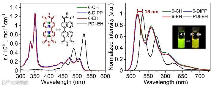 B2N2-PDI的吸收光谱在400-550 nm的区间内出现了与PDI相似的四重峰,但是B2N2-PDI在该区域的吸光系数有了明显下降且吸收峰有20 nm左右的蓝移。而在300-375 nm区间,B2N2-PDI展现出了PDI所不具有的强吸收峰。通过TD-DFT计算,这个高能量区的吸收来源于HOMO−5 → LUMO+1 和 HOMO−6 → LUMO+1跃迁。B2N2-PDI的荧光光谱与PDI相比同样发生蓝移(16 nm),同时荧光量子产率(40%左右)有明显下降。