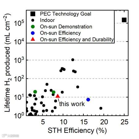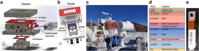 在近期Chem Catalysis 中,美国斯坦福大学的Thomas F. Jaramillo和国家可再生能源实验室的James L. Young团队针对用于户外测试的PEC反应平台设计,发表了题为“Demonstration of Photoreactor Platform for On-Sun Unassisted Photoelectrochemical Hydrogen Generation with Tandem III-V Photoelectrodes”研究论文。该团队开发了一种多功能的户外PEC反应测试平台,可用于光电分解水测试并得到所用PEC器件的产氢效率和使用寿命。该平台通过将PEC器件安装在太阳跟踪器上可实现对户外条件的实时检测,并进行户外PEC分解水测试。本研究论文中通过在该平台上测试MoS2 / GaInP2 / GaAs叠层光电极,实现了无外加电压下的水分解产氢且STH高于8%。