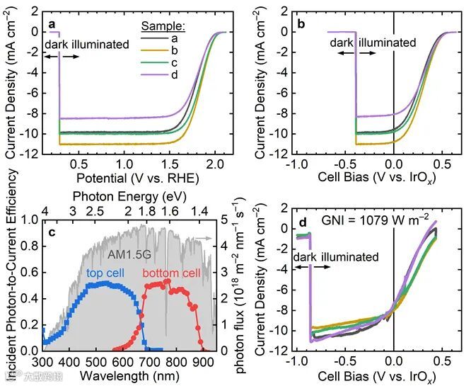 作者首先在实验室内测试了单太阳光源(one-sun)条件下MoS2/ pn-GaInP2 / pn-GaAs光电极的性能,在三电极体系中分别测试并获得了4个光电极的极化曲线(如图2a),平均最大光电流为-9.8 mA/cm2,起始电位为1.95 V vs RHE,高于分解水热力学电位1.23 V。随后作者以IrOx为辅助电极测试了该光电极在两电极体系的性能,如图2b所示,起始电位为0.45 V vs IrOx,短路电位时(0 V vs IrOx)光电流可达-9.54 mA/cm2,以上两种体系中的测试结果都证明该PEC器件可以实现无外加电压的水分解。图2c是该PEC器件中GaInP2顶电池(蓝线)和GaAs底电池(红线)的光电转换效率,对比AM1.5G太阳光谱,将其积分后可得到两电池上产生的电流密度分别为7.98 mA/cm2和7.06 mA/cm2,最终该PEC器件在AM1.5G照射下的电流密度为7.06 mA/cm2,由此可得到该PEC器件的STH为8.7%。