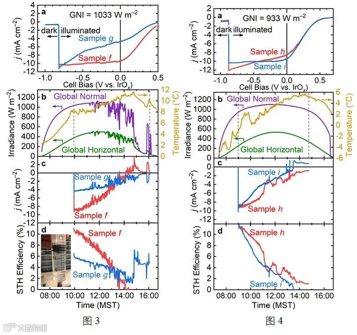 将同样的PEC器件放置在上述反应平台上在户外(2019年12月20日中午MST时间11:52)进行两电极体系测试,所得到的极化曲线如图2d,4个器件测试后平均短路电流为-7.6 mA cm-2,平均起始电位为0.37 V vs IrOx。在使用双轴太阳光追踪器的条件下,PEC器件可利用的最大光功率密度(global normal irradiance,GNI)为1080 W m-2 (相当于1.08个太阳照射)。以上室内、户外测试数据结果显示该反应平台用于PEC分解水测试是可行的。
