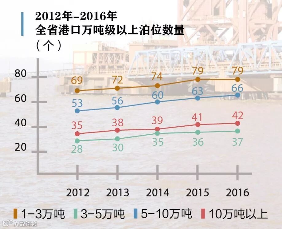 2012年-2016年全省港口万吨级以上泊位数量