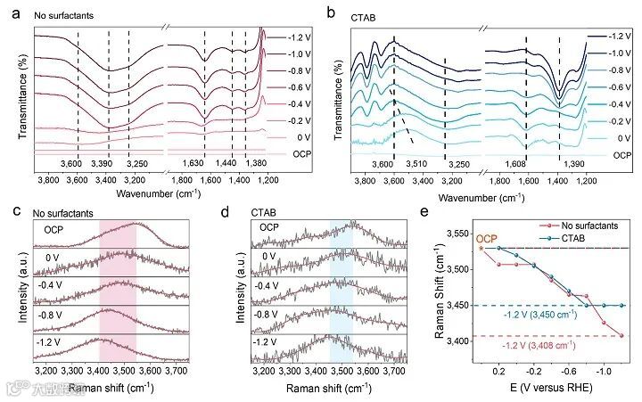 通过原位ATR-SEIRAS和原位表面增强拉曼光谱(in situ SERS)来揭示表面活性剂在对界面水环境的调控机制。利用原位ATR-SEIRAS从OCP到-1.2 V,在KHCO3电解液中,加入或不加入CTAB两种体系进行对比分析。随着偏置电位的增加,ν-OH (~ 3510 cm-1) 的解吸峰明显红移至3600 cm-1,从OCP到-1.2 V,解吸峰强度增强,表明isolated water分子数量显著减少,并在界面形成了高度疏水的微环境。此外,作者进行了原位SERS测试,研究水在带电界面上的取向对偏置电位的依赖关系。如图3c和3d所示,两个体系中O-H拉伸峰的蓝移程度明显不同。在电解液中加入CTAB后,水峰的蓝移明显受到抑制。在-1.2 V时,不含CTAB的体系在3408 cm-1处显示了O-H拉伸峰(图3e)。对于含有CTAB的体系,O-H拉伸峰在-1.2 V时位于3450 cm-1处,证明了CTAB可以有效地抑制界面水分子的氢原子向电极表面靠近,从而抑制了电解水析氢的活性。