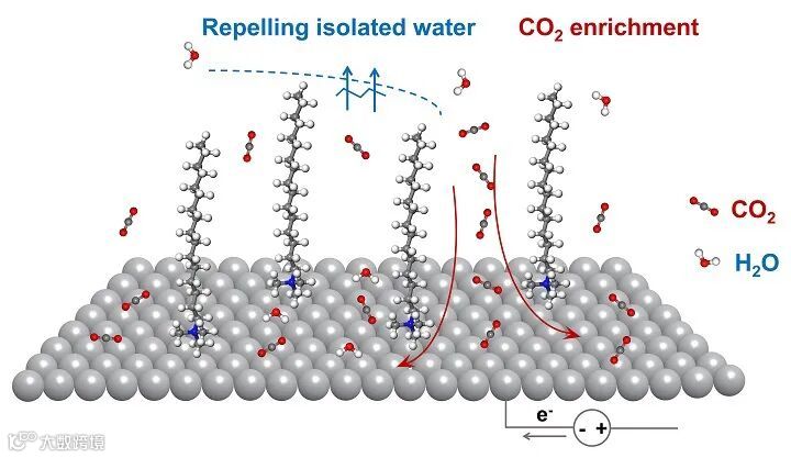 基于此,华东理工大学李春忠教授团队以CO2和H2O在商用银电极上的电催化共还原作为模型系统,以疏水性季铵盐阳离子表面活性剂作为电解液添加剂(图1),探讨了界面微环境随偏置电位的动态响应规律以及催化选择性演变的起源。相关成果近日发表在Journal of the American Chemical Society 上。该工作第一作者为博士研究生葛旺鑫和陈育新,通讯作者为李春忠教授和江宏亮特聘研究员。