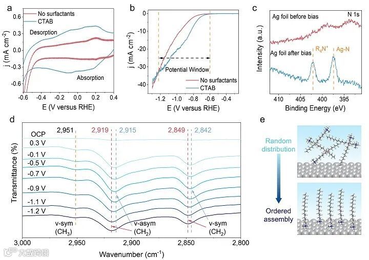 基于电化学分析和原位表面增强红外吸收光谱(ATR-SEIRAS),研究了表面活性剂在电催化剂表界面的动态组装行为(图2)。如图2a所示,含有表面活性剂的体系表现出典型的可逆吸附/解吸特征,而纯KHCO3电解液中没有这种特征,这一特性归因于CTAB可逆吸附/解吸产生的赝电容特性。通过原位红外光谱对表面活性剂在带电界面处的结构动态转变过程进行探究(图2d),发现随着偏置电位从-0.7 V变化到-1.2 V,2915和2842 cm-1处表面活性剂尾部的C-H基团的振动强度逐渐减小,并出现红移,表明CTAB侧链逐渐从电极表面脱附,使头部基团中在2919和2849 cm-1处的C-H基团的振动出现在光谱中。原位ATR-SEIRAS结果证实,CTAB分子在从OCP到-1.2 V的偏置电位下经历了从随机分布到近乎有序组装的构型转变(图2e)。构型演化的偏置电位窗口与LSV曲线的结果吻合,表明有序的表面活性剂组装结构有利于CO2和H2O的共电解。