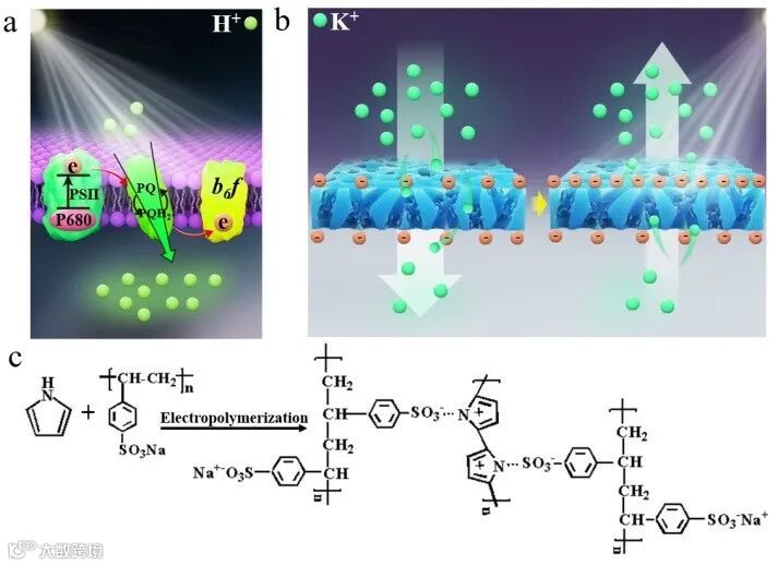 叶绿体内进行的光合作用是自然界重要的光化学反应之一。在叶绿体的类囊体膜上存在着两个的光系统PS I和PS II。在太阳光照射下,PS II中的光生电子将质体醌还原为质体醌醇,后者将叶绿体基质中的质子逆化学势泵入腔内,并将电子释放到细胞色素b6f复合物中。这种光动力的质子非自发扩散(即离子泵效应)在类囊体膜上建立质子梯度,用于合成三磷酸腺苷。受光合作用中质子逆化学势扩散的启发,作者在导电高分子膜中实现了光动力的离子非自发扩散。