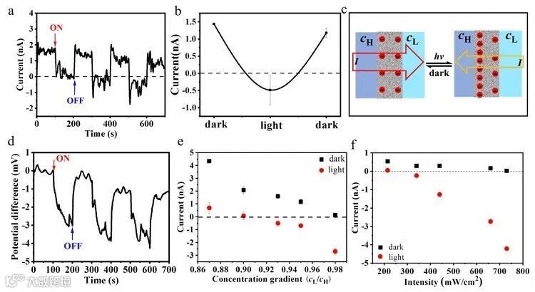 在上述导电高分子膜的一侧施加可见光照射时,聚吡咯中的光致电荷分离使膜两侧的电位产生差异,形成一个横跨导电高分子膜的自建电场。该光生电场为阳离子的逆化学势梯度扩散提供动力,表现出光动力的离子非自发扩散(即离子泵浦效应)。理论模拟进一步证实了阳离子的非自发扩散过程。减少浓度梯度或增加光照强度能够优化导电高分子膜的非自发扩散性能。该工作实现了导电高分子膜中离子的逆化学势迁移,在纳米流体能量转换与储存、离子传输调控以及人工光合作用等方面具有潜在的应用。