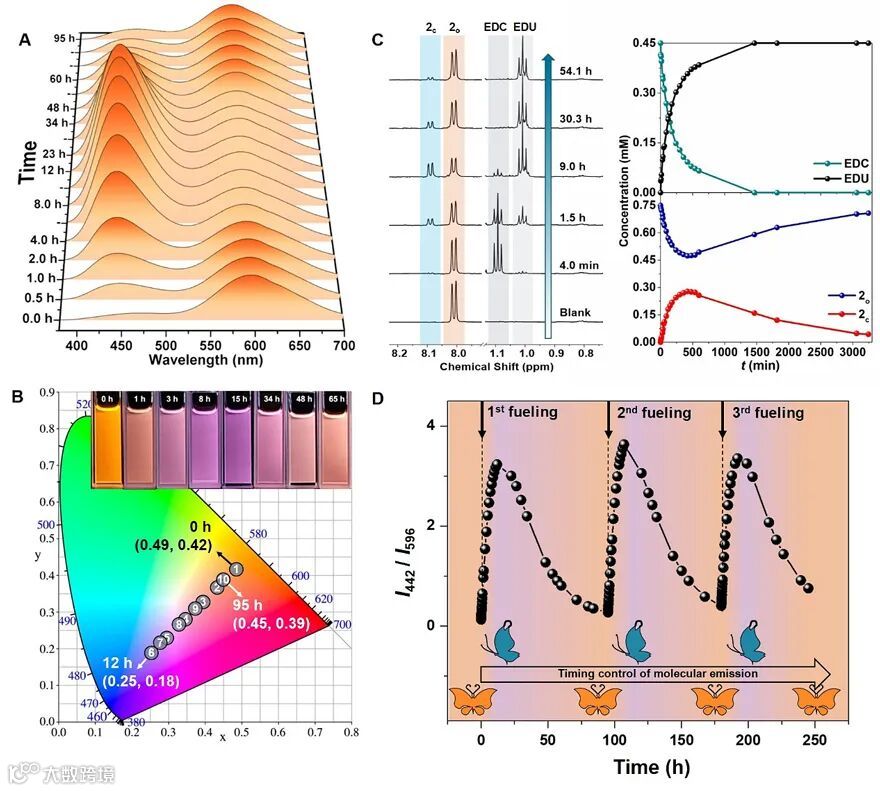 作者通过荧光光谱实时监测体系的发光变化,体系的荧光颜色从DPAC溶液本征的荧光橙色,在加入燃料一段时间后逐渐变为蓝紫色,随后回到橙色。他们通过核磁共振氢谱实时监测化学循环过程中的各物质浓度,并多次加入化学燃料EDC,证明了该体系的可循环性。