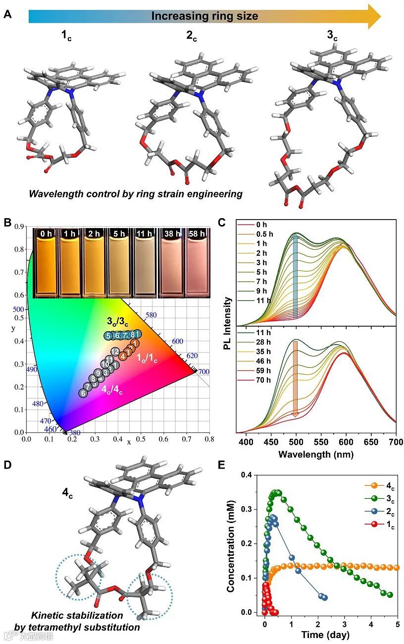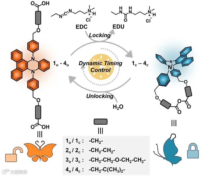 二氢二苯并吩嗪类衍生物(DPAC)是田禾院士团队开发的具有振动诱导发光特性的“明星”分子。在光激发下,DPAC分子会表现出具有独特的构象自适应多色发光行为。在前期工作中,多种策略已被成功地应用于构建以DPAC为荧光核的多色发光体系,比如共价环化、非共价环化、机械互锁相互作用、聚合物中的微环境控制等。研究人员在DPAC的两端引入羧基封端的柔性链,将功能化的DPAC分子溶解在水性介质中,添加化学燃料EDC驱动分子内的环化反应,从而限制荧光团DPAC的构象自由度,改变荧光发射波长。这些分子锁通过和环境内水分子发生的水解反应,自动地解锁回到初始状态,实现了对体系时间尺度下的动力学控制和功能分子体系多色荧光的动态时序调控。
