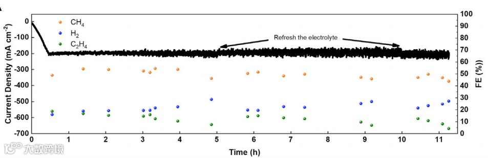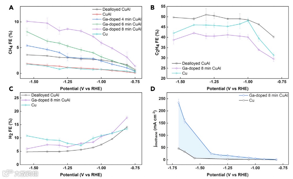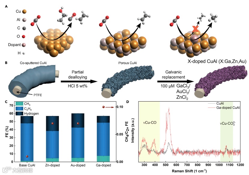 简言之,研究人员通过简单的三步合成法,成功制备了高活性Ga-掺杂的CuAl催化剂(图1B),可在保持高*CO覆盖度条件下“打断”C-C偶联反应、抑制析氢反应(HER),提高甲烷产物选择性。该工作为如何平衡高浓度*CO吸附中间体与不同碳氢产物比例方面提供了新的研究思路。