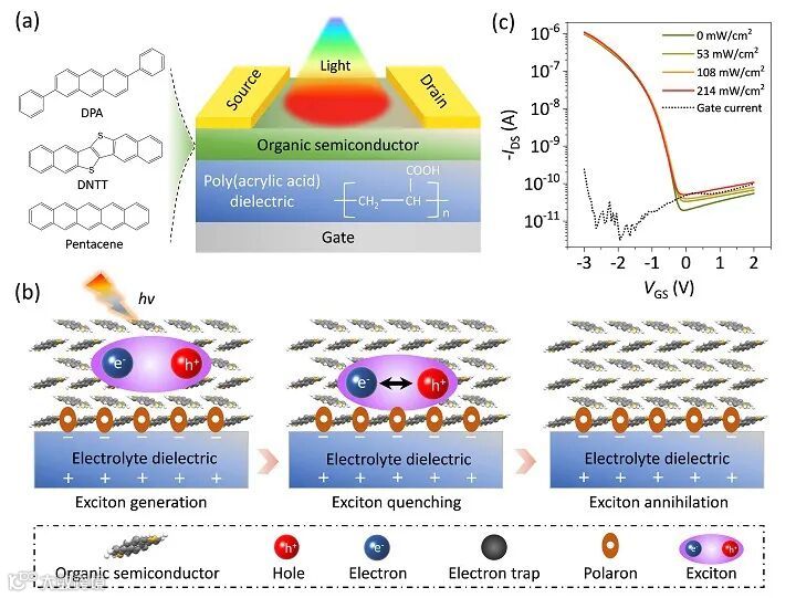 极化子的密度决定着极化子—激子淬灭效率。采用具有双电层电容性质的聚合物电解质材料(聚丙烯酸)作为有机晶体管的介电层,该介电层在栅电压作用下发生电离。相应的离子在电场驱动下迁移到介电层/半导体界面,在有机半导体中诱导出高密度电荷。同时,在异性离子的库伦力作用下,大量的电荷被静电束缚在介电层/半导体界面上形成界面极化子。如图3所示,高密度界面极化子能够高效淬灭光生激子,淬灭效率高达70%。该策略具有优异的分子普适性,有机晶体管的耐受光强最高可达214 mW/cm2,有效抑制了有机半导体的本征光电响应。相关工作发表于ACS Applied Materials & Interfaces。[2]