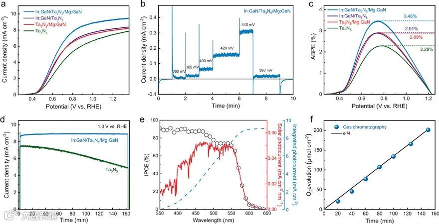 图2. In:GaN / Ta3N5 / Mg:GaN薄膜光阳极的PEC催化性能