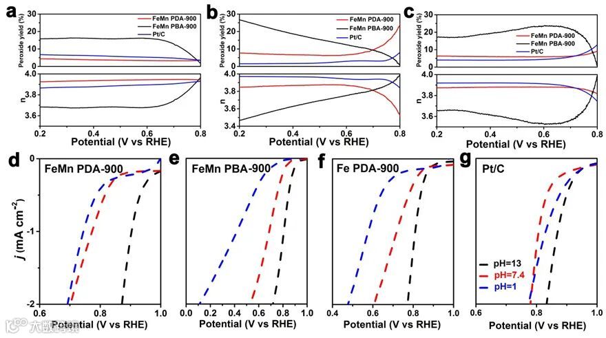 Figure 5. Yields of H2O2 and n of FeMn PDA-900, FeMn-PBA and Pt/C under (a) 0.1 M KOH, (b) 0.2 M PBS and (c) 0.1 M HClO4 conditions; LSV diagrams of (d) FeMn PDA-900, (e) FeMn PBA-900, (f) Fe PDA-900 and (g) Pt/C catalysts at different pH.