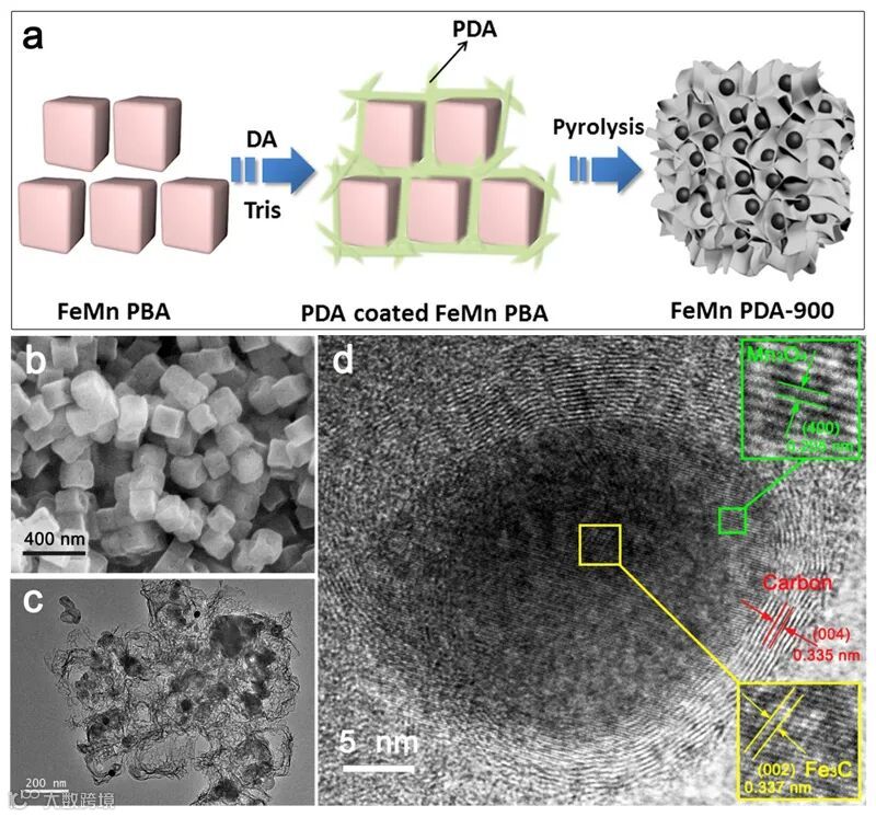 作者通过如Fig. 1a所示的一系列操作制备了FeMn PDA-900电催化剂,并进行了一系列表征。为了比较,还合成了不加PDA涂层的FeMn PBA-900和不加Mn元素的Fe PDA-900。