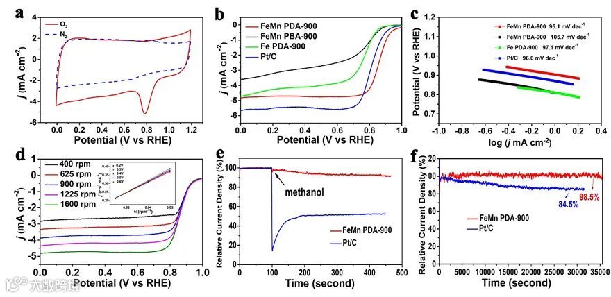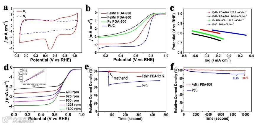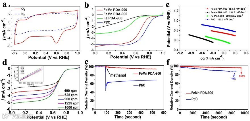 Figure 3. (a) CV curves of FeMn PDA-900 in N2 - and O2 - saturated 0.1 M HClO4 electrolyte; (b) LSV curves and (c) the corresponding Tafel curves of FeMn PDA-900, FeMn PBA-900, Fe PDA-900 and Pt/C; (d) LSV curves of FeMn PDA-900 at different speeds; (e) I-t curves of FeMn PDA-900 and Pt/C catalysts before and after adding methanol; (f) The long-term stability curves of FeMn PDA-900 and Pt/C catalysts at 0.7 V.