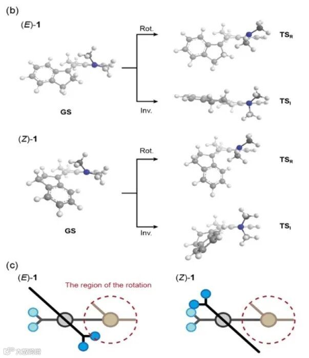 二甲氨基(DMA)取代刚性二苯乙烯(1),展示出热螺旋反转和C-N键旋转的可切换相对速率。(