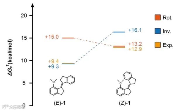 导读:台湾大学杨吉水教授等人研究了二甲氨基(DMA)取代刚性二苯乙烯,展示出热螺旋反转和C-N键旋转的可切换相对速率。(Z)-1中DMA转子旋转速率更高,而(E)-1中反转速率更高,导致相关核磁信号存在竞争