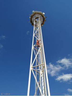 在铁路北仑港站高达26米的灯塔架上,码头工程人员在安设微波接收天线。